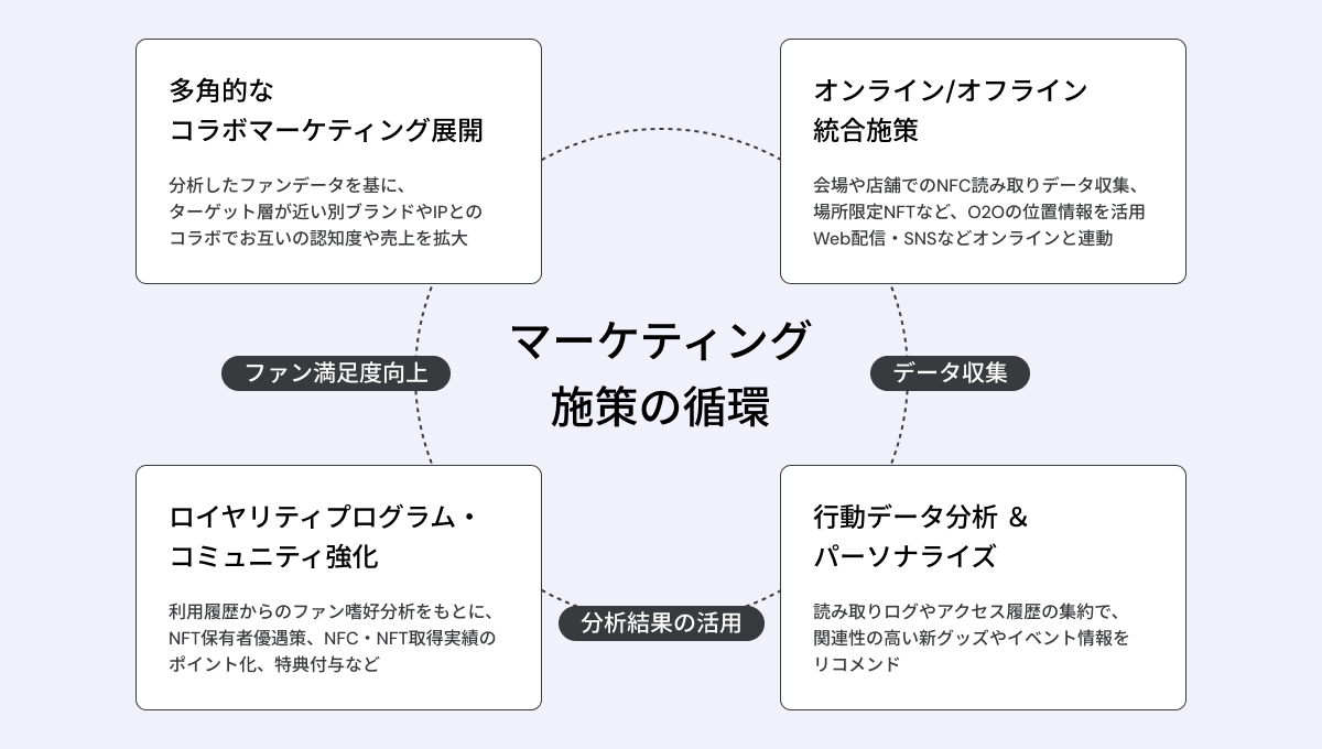NFC読み取り回数・タイミング・取得特典の種類など、購買後の行動データを収集・分析することで、関連商品のレコメンドや優遇施策の設計に活用できます。イベント会場・店舗でのリアル行動データと組み合わせたO2O施策、他ブランドとの相互送客キャンペーン展開など、再販オペレーションと連動したデータドリブンな運用基盤を整備します。